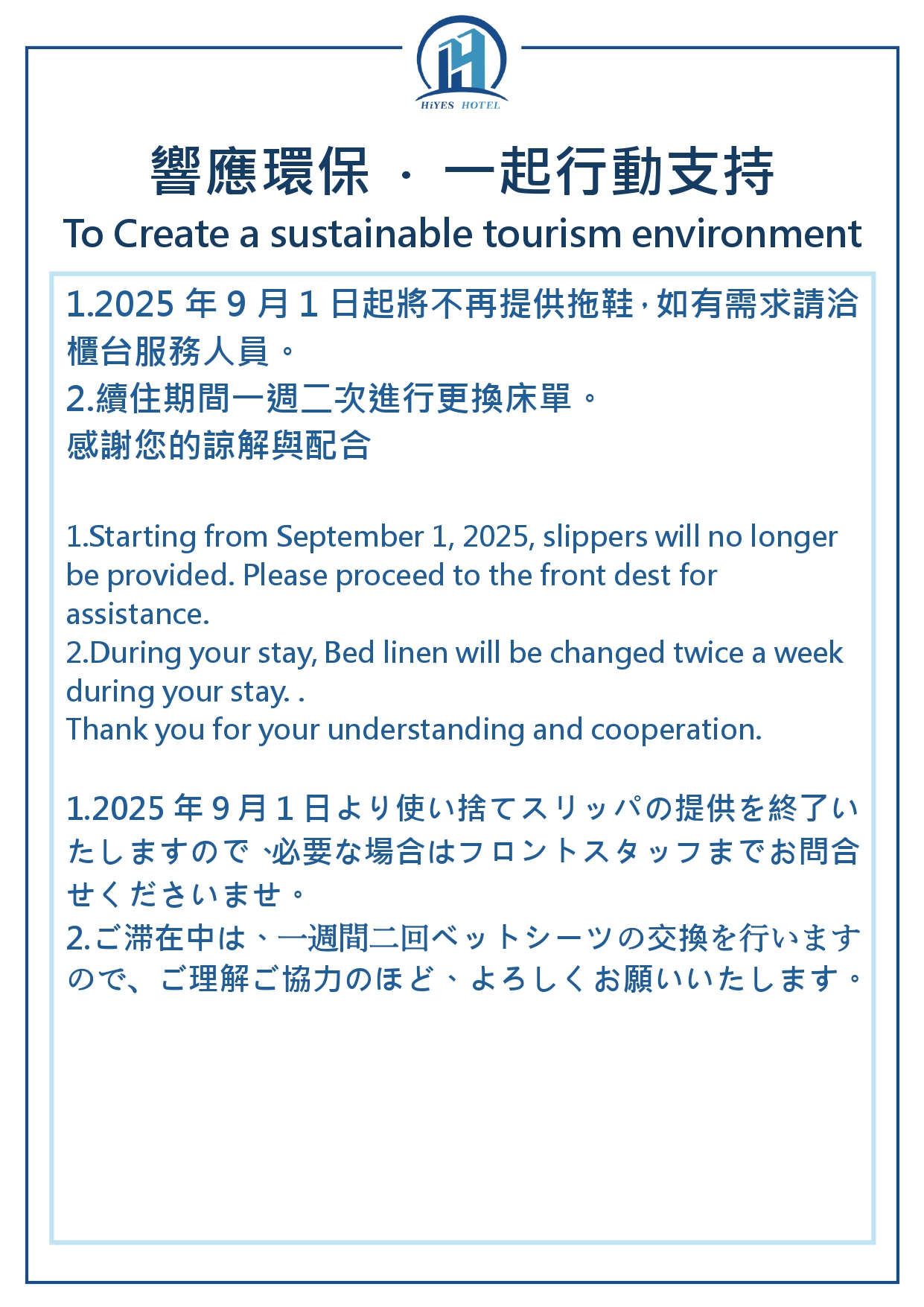 1.2025年9月1日起將不再提供拖鞋,如有需求請洽櫃台服務人員。